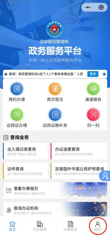 在微信搜索栏输入“移民局”,点击搜索,找到“移民局”小程序,打开小程序,点击右下角“我的”进行登录。