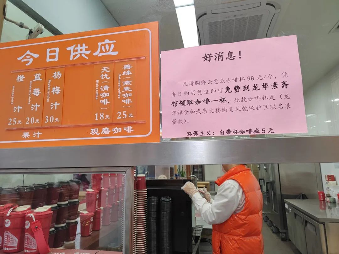 我看窗口还有兑换活动,买一个这种红色咖啡杯手办可以免费获赠一杯咖啡,咖啡杯还是寺庙跟武康大楼联名的限量款