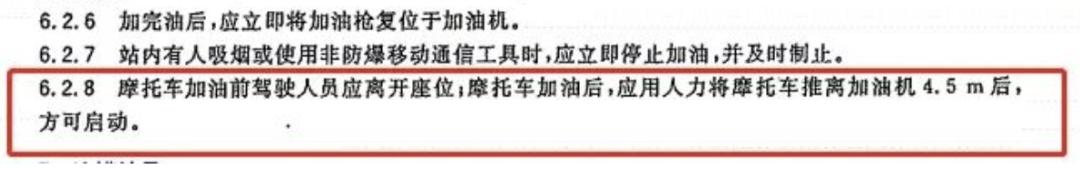 “摩托车加油前驾驶人员应离开座位;摩托车加油后,应用人力将摩托车推离加油机4.5米后,方可启动。”
