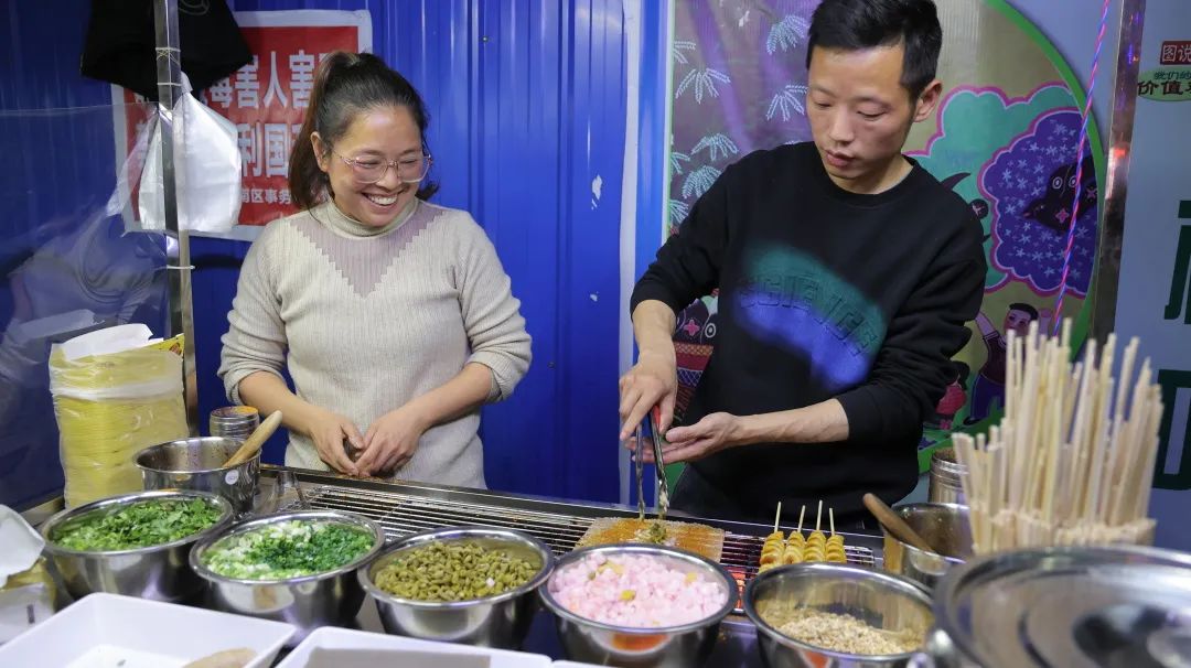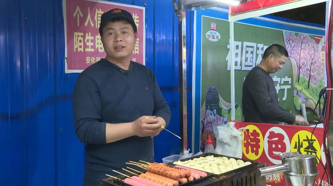 两年前,毛望国和妻子在安化县城北区一起经营一家小吃店,因为疫情的影响,门店倒闭。生活所迫,夫妻俩便在城区支起了小吃摊,每天不定时不定点出摊,收入更是极不稳定。在了解到安化县城管局在进行夜市摊招募的消息,他立马报了名。毛望国告诉记者:“现在城管帮助我们管理,这里客人又多,我只要把东西做好吃就可以了,现在每天至少能赚个400块钱,收入还是不错的。”烧烤摊摊主谌超: