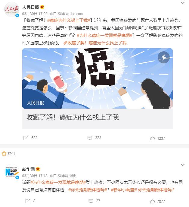 而且,打开这个话题,还有很多官媒也在紧跟这个话题聊癌症预防和科普。