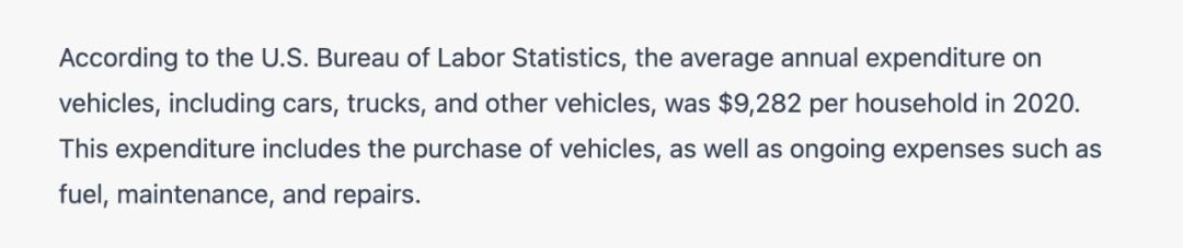 以下是ChatGPT的回答,来自2020年美国劳工局的数据,每家人一年花费在车上的钱,为$9,282,包括汽油、保养和维修。没说保险。