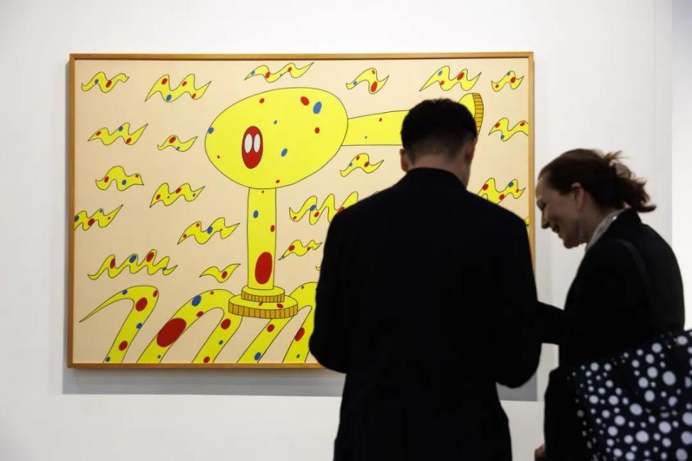 2023年,东京画廊+BTAP位于“艺廊荟萃”展区的展位现场。/巴塞尔艺术节认出资深藏家的脸,与他们社交,是艺术圈生存之道。社交名利场的另一面是,每家画廊都得想办法赚回参展费(以一号厅一70平方米的展位为例,展位费约为41万人民币,这个价格大概是上海某艺博会的1.5倍)。