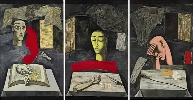 张晓刚《黑色三部曲:惊恐、沈思、忧郁》2020年香港苏富比拍卖成交价:HKD 5492万。/佳士得巴塞尔里,你能找到厉害的先锋的东西,也可发现一些冉冉升起的艺术家,还可指认一些重复的图腾,譬如“形式主义边角料”“卡通Ins风潮流系”。