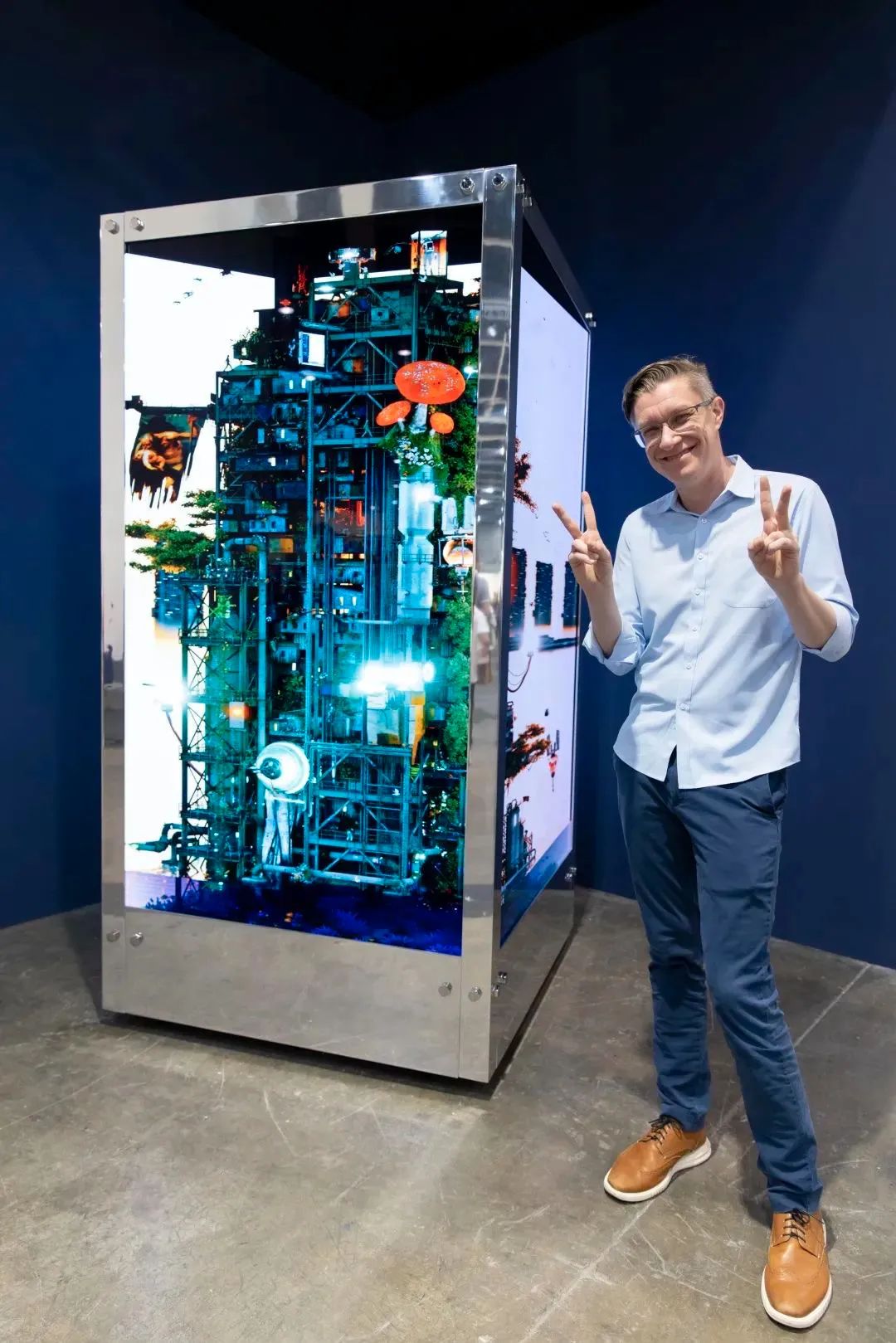 香港巴塞尔现场,Beeple本人现身,而他的动态沉浸式雕塑作品《S.2122》亦以900万美元售出。/厉蔚阁,摄影:Paul Ching但从另一面看,它又将当代艺术推向更虚幻的虚拟世界。
