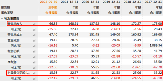 业内人士表示,近期新湖中宝密集发布债券、票据进行融资或与其自身业绩下滑有所关联。Wind数据显示,2017年-2021年及2022年前三季度,新湖中宝分别实现营业收入175亿元、172.27亿元、148.1亿元、137.92亿元、168.91亿元、66.83亿元,同期归母净利润分别为33.22亿元、25.06亿元、21.53亿元、31.65亿元、22.37亿元、15.98亿元,财务指标逐年下滑。