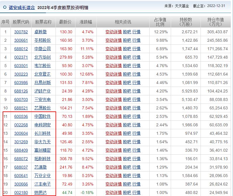 比如蔡嵩松管理规模最大的诺安成长混合,该基金2022年末前10大重仓仍以芯片股为主,但前11-20的“隐形重仓股”分别为中国软件、电科网安、长川科技、华大九天、富创精密、拓荆科技、芯源微、万业企业、江丰电子、纳思达。