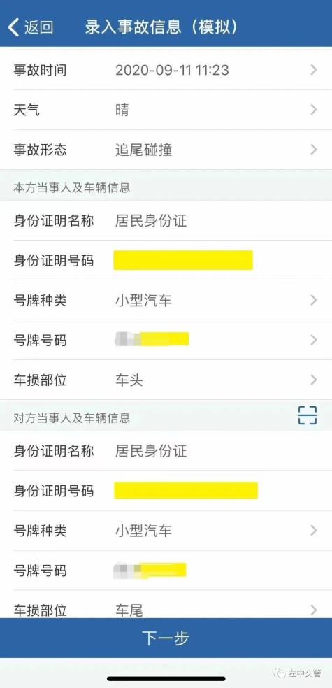 二点选“录入事故”,拍摄3~6张照片取证并上传,交警后台审核。