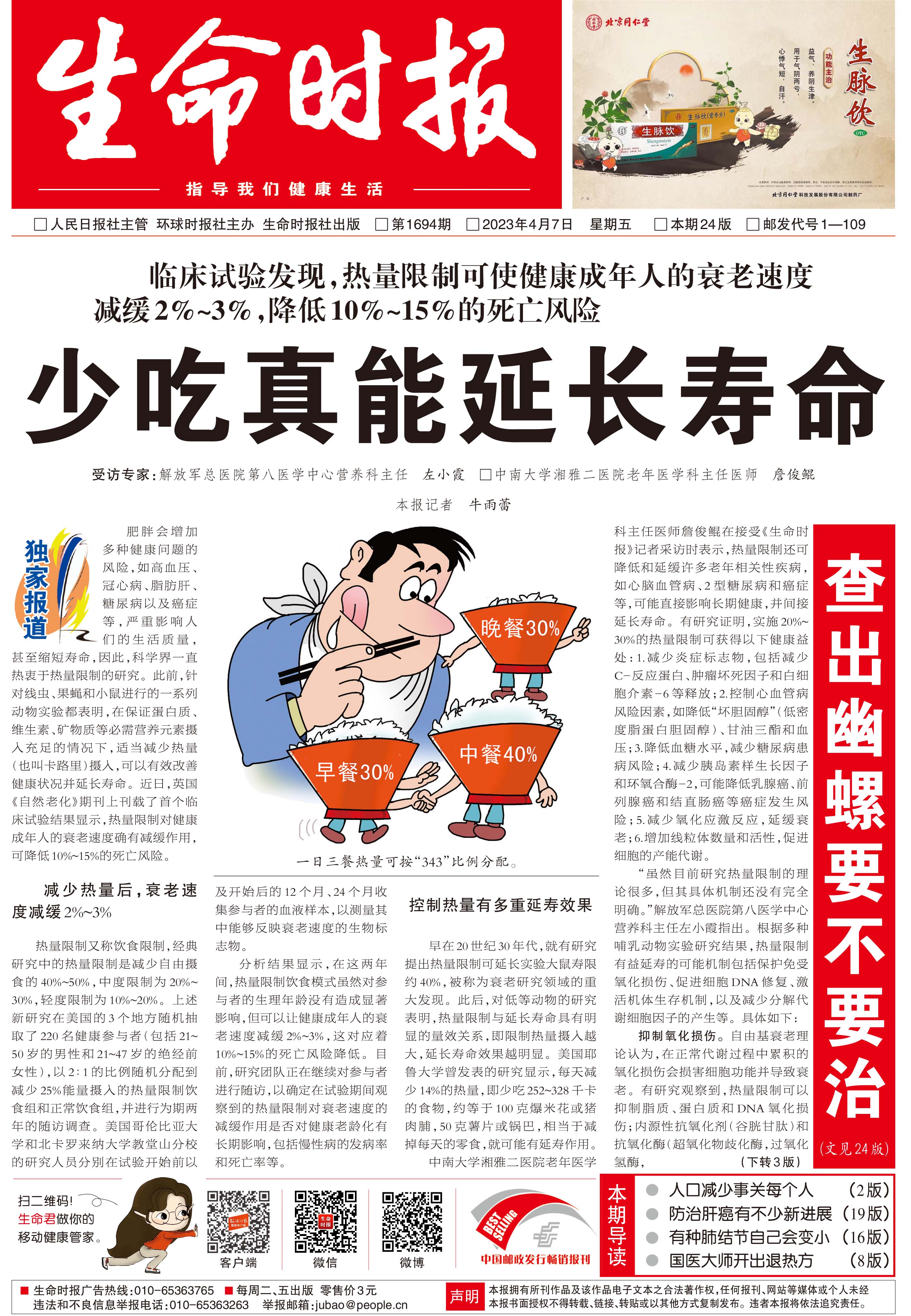“通常,热量限制被定义为热量摄入减少30%~40%(相对于日消耗能量),但目前并没有‘正式’的限制规定。”詹俊鲲说,相比其他人,减肥人士、高龄老人更容易出现热量不足的情况,建议在设法调整热量摄入的同时,一定要重视蛋白质、维生素、矿物质等必需营养素的充足摄入。▲
