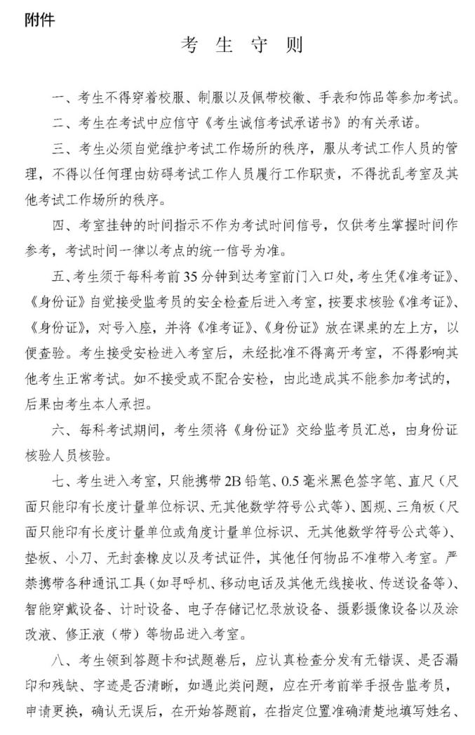 3、考生应自觉遵守国家教育考试相关规定,在考试过程中严格遵守考试纪律和考场规则,服从考试工作人员管理,主动接受监考员按规定进行的身份验证和对随身物品等进行的必要检查。遵守《考生守则》(附件),对发现的考生违纪、作弊等行为,将按照《国家教育考试违规处理办法》(教育部33号令)及有关规定进行处理,并将记入国家教育考试诚信档案。情节严重,触犯刑律的,将按《刑法》修正案(九)第二十五条追究刑责。