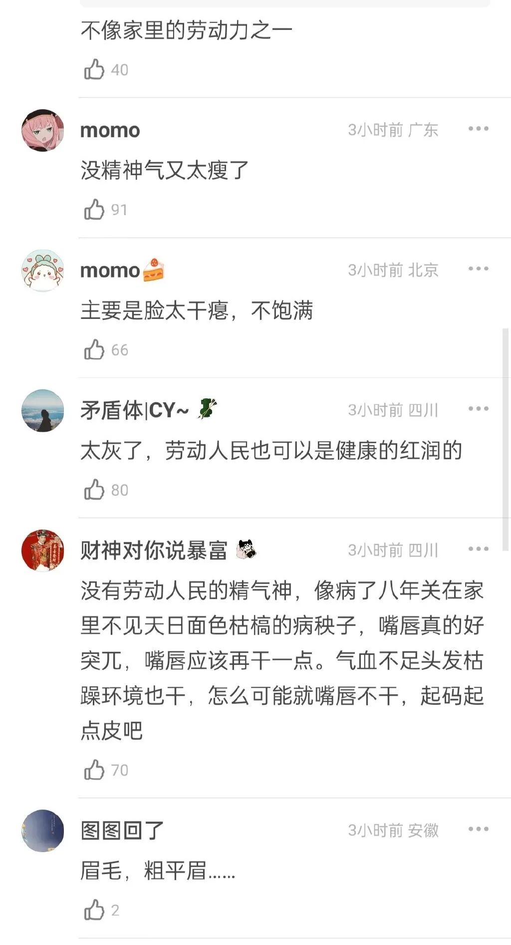 在网上流传的几张热议剧照中,李沁的扮相整个人脸色发灰、瘦弱脱相,既不像惯常人们眼里颇有姿色的村花,又不像农村里能干有劲的田间女人,差评接踵而至。