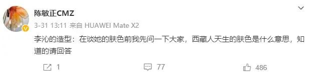热搜吵嚷了几天,造型师陈敏正给出的回应是“那些吐槽她皮肤黑的宝贝们,不信把你放在陕北的山村里户外忙上两个月,过后再来我的微博晒晒你的皮肤。”