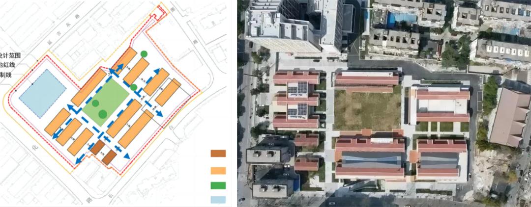 228街坊旧改采用“挖掘、重构、强化、传承”四个步骤的记忆传承模式,既有对部分旧建筑的完整保留和修缮,也有在原来建筑的基础上进行的合并和复建。改造依照一个中心两横两纵的规划格局,以及树院浓荫,内聚向心的景观布局,对原本12栋两万户建筑两纵两横,外场内院的空间布局进行完整的保留。