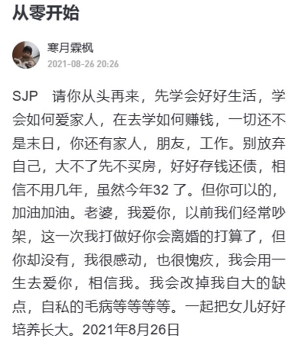 但意外的是,老婆原谅他了,她说大不了重新来过。所以那天晚上,寒月霖枫写下了一篇专栏,标题叫做《从零开始》。