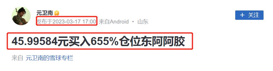 帖子之所以引起讨论,是因为东阿阿胶这支股票,已经成了他的标签之一。