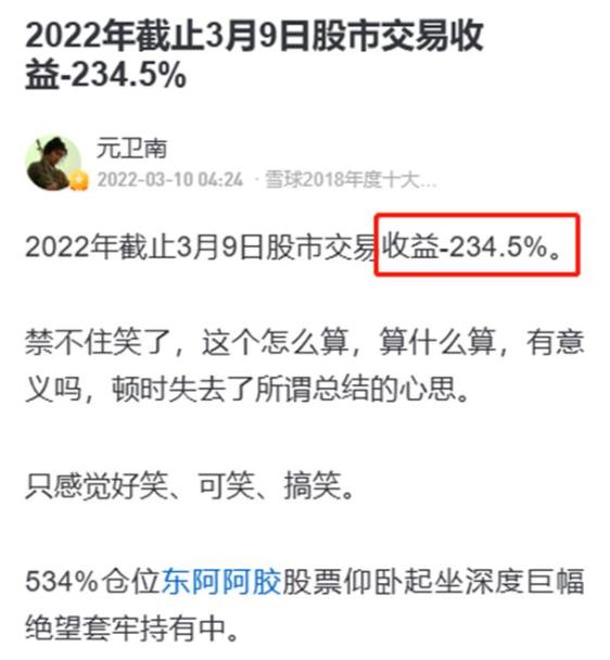 2018年,他斥重金买入东阿阿胶,短暂地拉升之后,这支股票的价格便开启了长达近两年的下跌,跌幅高达50%以上。从此,他也就和这支股票结下了不解之缘。