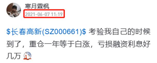 一位名叫寒月霖枫股民也是如此,赚到钱之后,大约是在21年5月的高点,加了重杠杆买长春高新。
