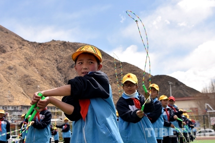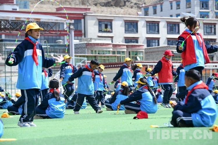 图为活动现场学生在学跳绳 摄影:次旦拉姆