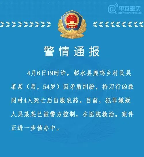 重庆彭水一村民持刀行凶致同村4人死后自服农药,已被警方控制
