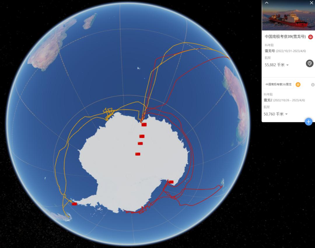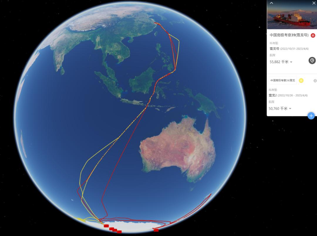 ▲中国第39次南极考察队两艘破冰船的航行轨迹(红色:雪龙号,黄色:雪龙2号)