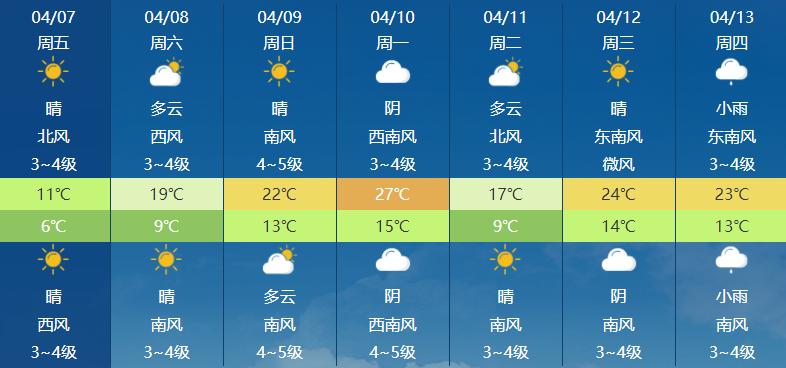 今天白天到夜间,天气晴间多云,北风3~4级,最低气温6℃,最高气温11℃。