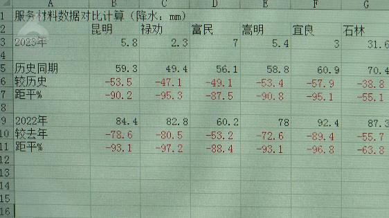 昆明市气象台台长李晓鹏表示:“今年1月1日以来,昆明降水明显偏少,到目前仅有6.9毫米,正常年份的话在58—60毫米左右,偏少88%。从监测的气象干旱情况来看,全市除了石林以外大部分县市区达到气象特旱的情况,是最近五年来最严重的一年。”