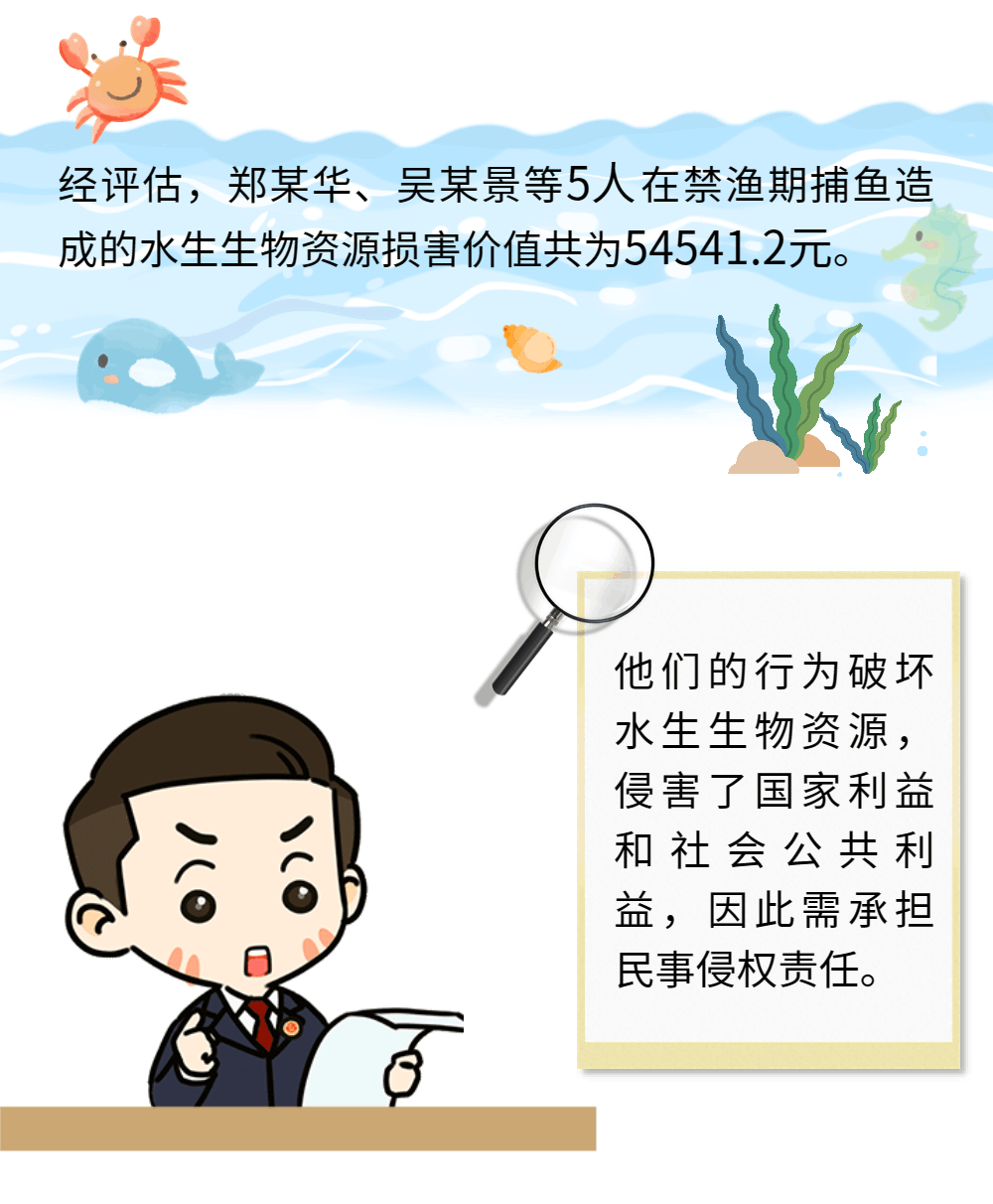 下面以郑某华、吴某景等5人非法捕捞水产品案为例,来看看禁渔期捕鱼涉及的法律责任。