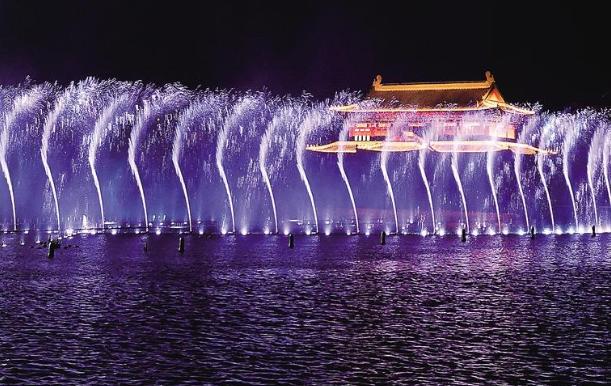 夜幕降临,这片水域瞬间灵动起来。水柱、灯光、激光……多种元素创新融为一体,音乐喷泉蔚为壮观,水幕电影缤纷绚烂,为市民带来一场震撼的视听盛宴。