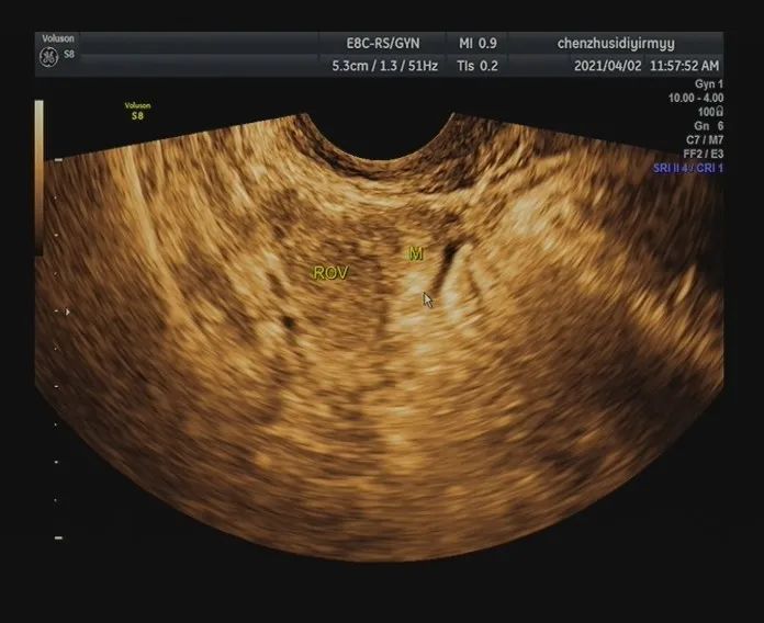 盆腔阴道彩超检查:子宫内未见明显异常回声团,左侧卵巢形态大小正常,右侧卵巢内可见一黄体声像,右侧附件区可见一大小约20mm×15mm的混合性包块,内可见一细小无回声区,包块周边可见少许血流信号。