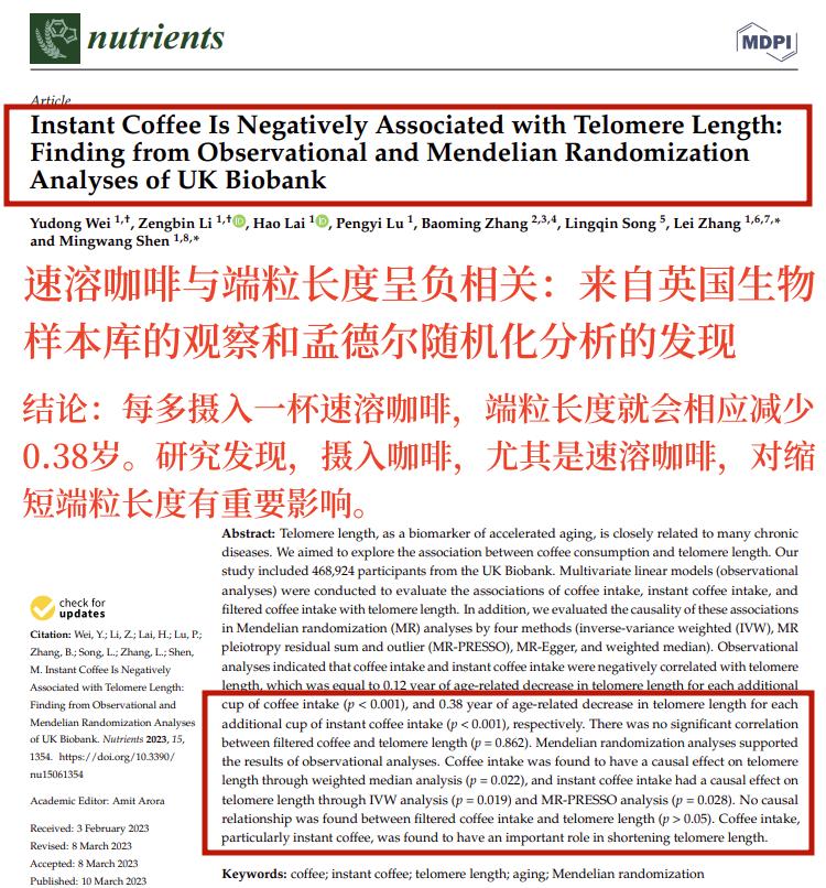 3.Instant Coffee Is Negatively Associated with Telomere Length: Finding from Observational and Mendelian Randomization Analyses of UK Biobank.Nutrients