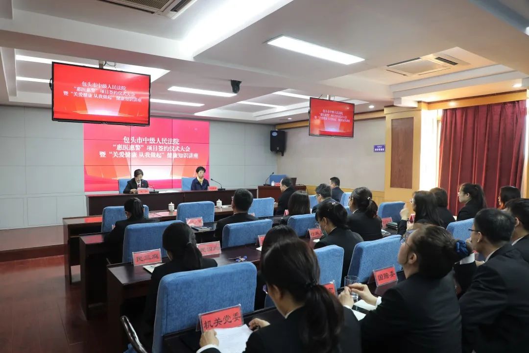 为进一步建立健全法院干警职业风险保障机制,加大对干警身心健康的保护力度,落实从优待警政策,保障法院干警享受便捷、高效、优质的医疗服务,包头市中级人民法院与包头医学院第二附属医院建立法院干警就医“绿色通道”等警医合作项目,4月6日上午,在市中院举行“惠医惠警”项目签约仪式大会暨“关爱健康 从我做起”健康知识讲座。