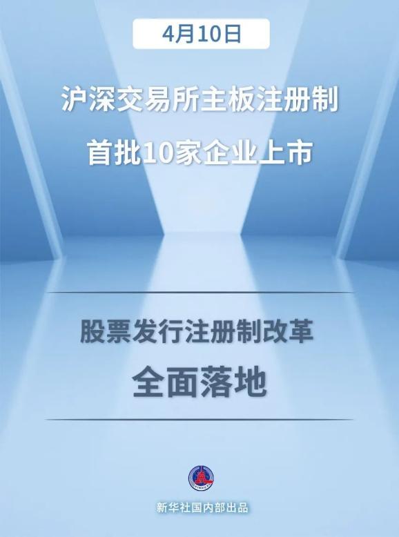 4月10日,主板注册制首批10家企业上市仪式在北京、上海、深圳三地连线举行。这标志着股票发行注册制改革全面落地,在资本市场改革发展进程中具有里程碑意义。