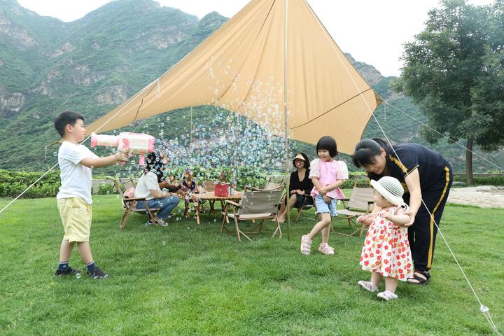 2022年7月2日,游客在河北省保定市涞水县的野三坡景区露营基地休闲玩耍。新华社记者 高博 摄 图源:新华网