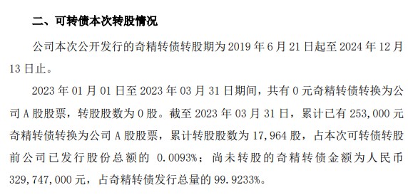 公司公告显示,2022年第四季度、2023年第一季度连续两个季度,奇精转债均未能转股。