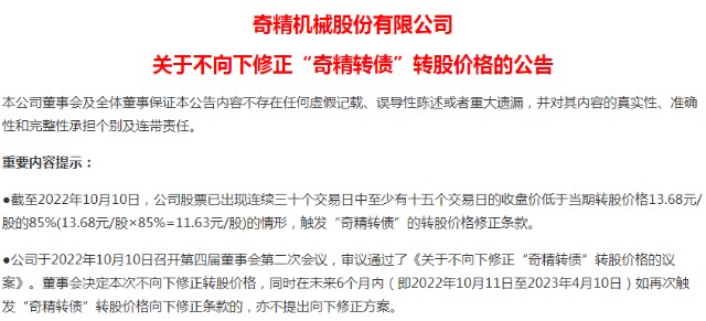 2022年10月11日,奇精机械发布《关于不向下修正“奇精转债”转股价格的公告》,公司董事会决定在未来6个月内(即2022年10月11日至2023年4月10日)不向下修正转股价格。