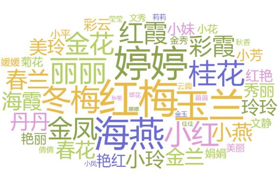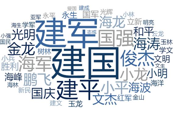 注:[1] 词云中的男女姓名和频率均取自2005年全国1%人口抽样调查;[2] 名字大小代表了出现频率; [3] 上为男名,下为女名。