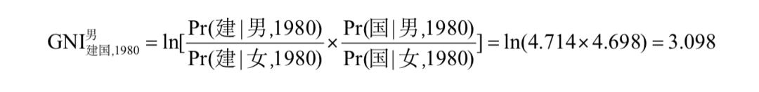 以一个出生在80年代叫做王建国的男性为例,“建”在80年代男女名中出现的概率比为4.714,“国”的概率比为4.674,两者相乘取对数,就得到了“建国”的GNI为3.098。考虑到男名GNI的均值为1.95,“建国”是个听起来男性特征极为明显的名字。