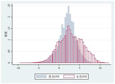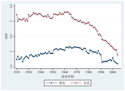 文中以2005年的1%人口抽样调查为姓名数据库,在区分性别和年龄组别的基础上,利用名字中的每个字在自身性别中出现的概率和对立性别中出现的概率之比代表性别特征,把名字中的每个字的概率比相乘,并取对数以减少指数的波动,就得到了每个名字的性别特征指数(Gendered Name Index,GNI)。