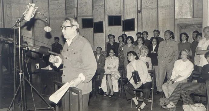 当年译制片配音工作场景,话筒前站立者为富润生。图源:上海电影译制厂那时候配主要角色的,还是以一些老同志为主,我配的主要的戏不多,也知道自己不一定能承担得下来,所以每抓到一个角色,不管戏多戏少,我都很下功夫。尽管工资非常低,但是觉得能够在这样的一个团队里面,从事自己喜欢的工作,已经很幸运了。从一开始从事这份工作只是一个尝试,后来慢慢感觉到它不仅仅是一个职业,而是一份事业,而且是我热爱的事业。从工作到退休,我一直都在这个单位,从来没有离开过。