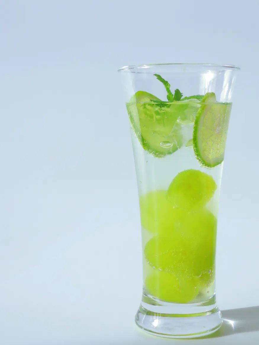 气泡水中浸润着大颗青提果肉是水果爱好者的心水之选