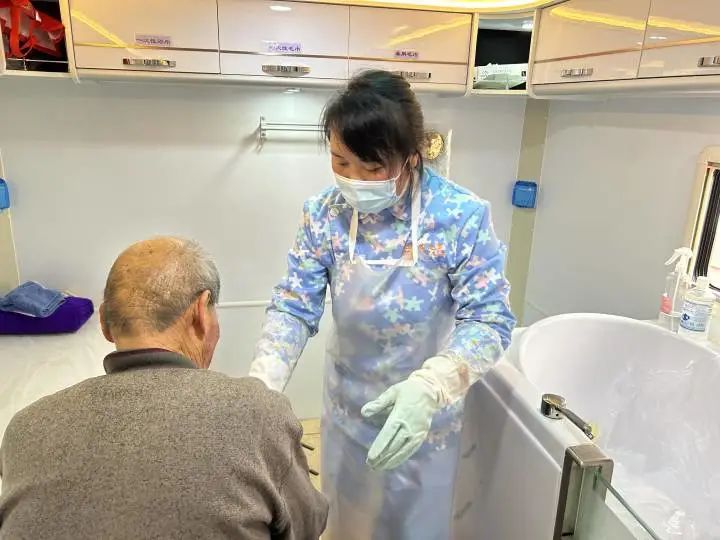在助浴车里洗澡与平时有什么不同呢?为了确保老人的安全,专业的医生护士会在洗浴前为老人测量血压、心率等,也会详细询问老人的基础疾病等情况;洗澡则是由专业的助浴师操作。今年37岁的张启琼此前是一名从事重症监护的医疗护工,机缘巧合之下成为了助浴师。“帮老人洗澡十分特殊。”张启琼说,整个过程要严格避免出现老人摔倒滑倒等情况,“我还会特别关注老人的微表情,多和他们聊聊天,让他们放松下来。”“很感激有这么好的服务,说实话我们在家里也没有这样给老人仔仔细细地洗过澡。”何忠英这次是陪同老父亲一起来的,她坦言,父母住在老房子里,没有专门洗澡的地方,尽管有时会接父母到自己家里洗澡,但父母怕冷、身体也不方便,大部分时候擦一擦就当洗澡了。