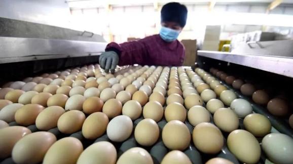邯郸市馆陶县一家蛋鸡养殖场的工人在查看鸡蛋品质。