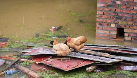 图为两只母鸡被洪水围困在漂浮的木板上。