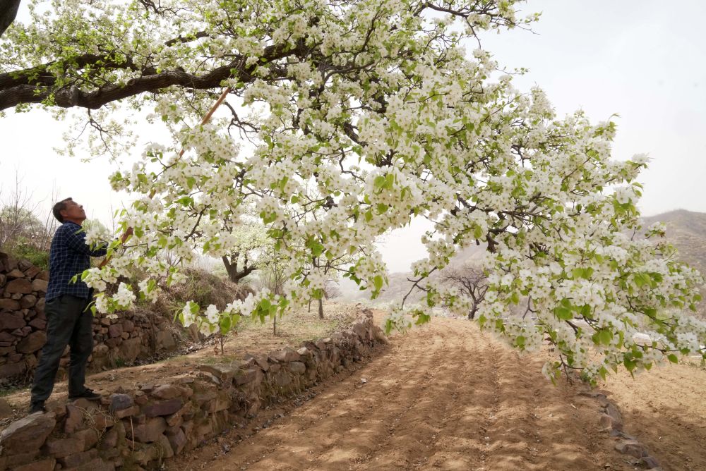 ↑4月12日,河北省青龙满族自治县官场乡山岭高村的农民在管护旱作梯田间的安梨树。