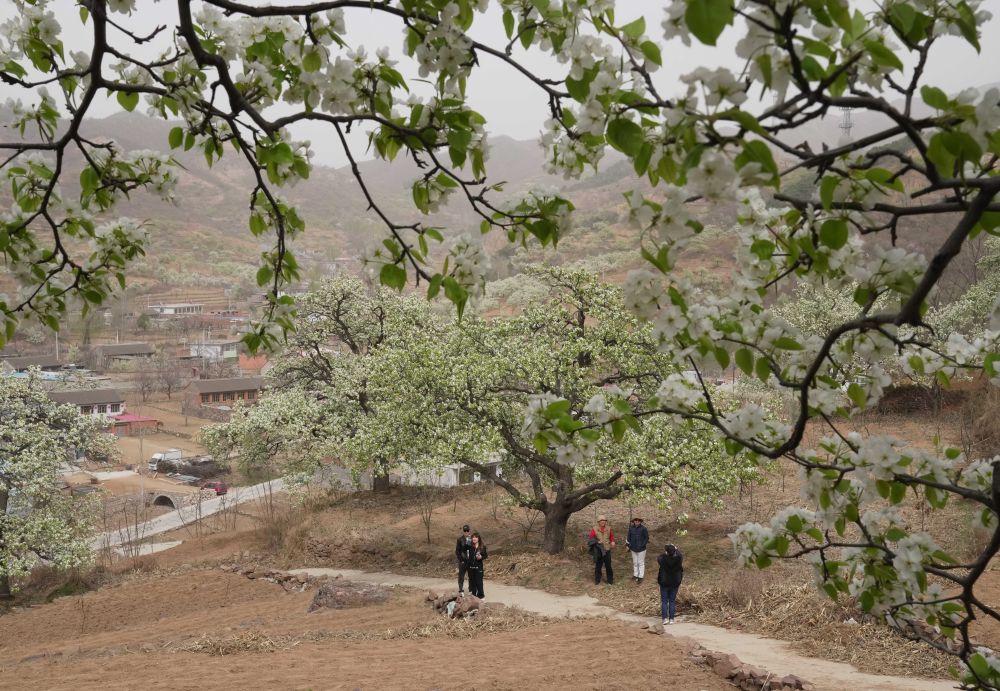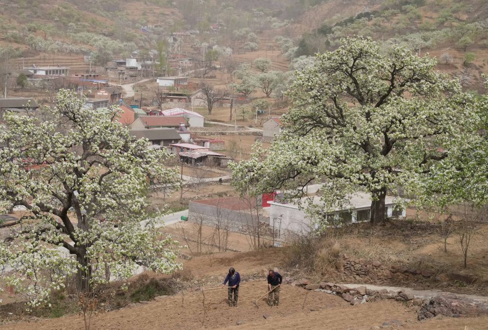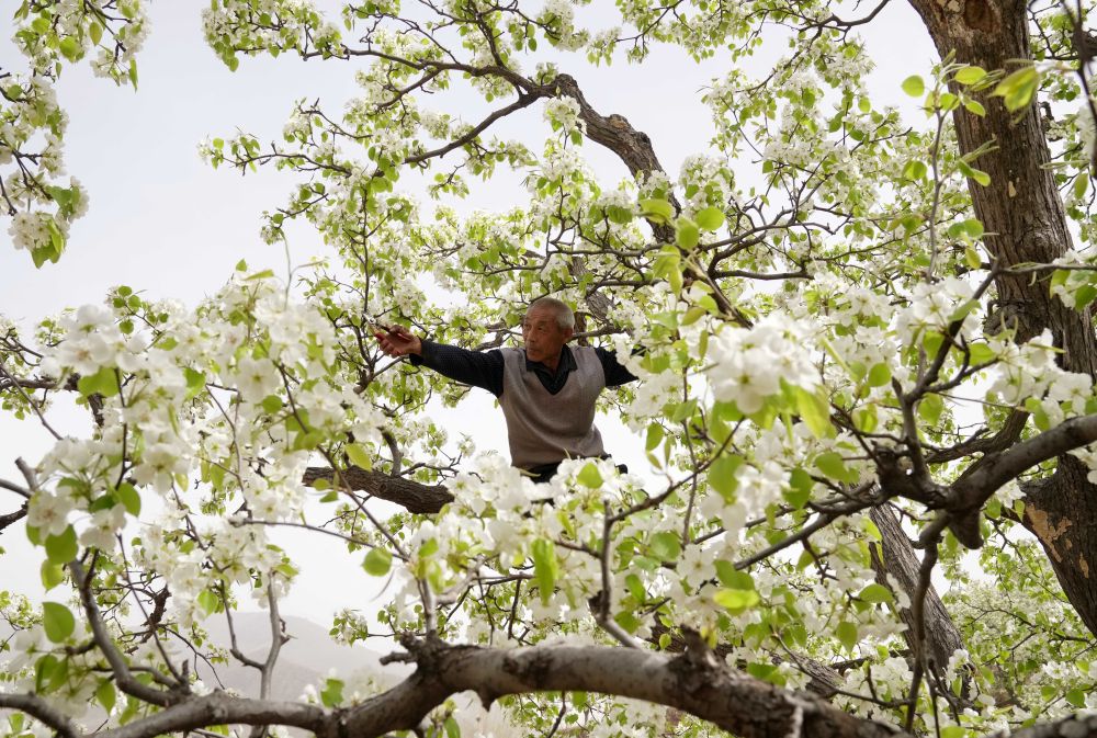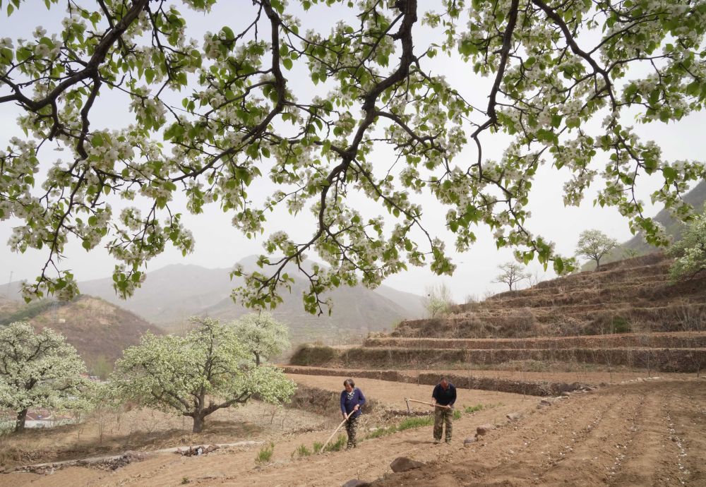 ↑4月12日,河北省青龙满族自治县官场乡山岭高村的农民在管护旱作梯田间的安梨树。新华社记者 杨世尧 摄