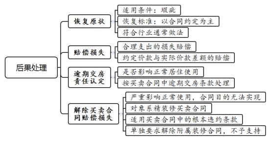 (三)精装修商品房买卖合同装修质量纠纷的后果处理审理精装修商品房买卖合同装修质量纠纷案件中,在因质量问题产生的违约责任确定后,需要根据违约责任的大小、后果的严重程度,并根据当事人的约定及法律法规规定,确定后果的处理方式。下文将循序渐进,根据不解除合同的后果及解除合同的后果分别进行讨论分析。