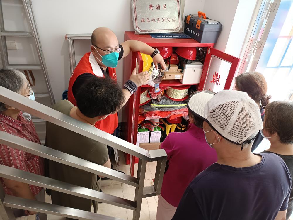 向小区居民介绍消防箱及应急箱内的各类求生工具和使用方法,保证灾害发生时能够应急和开展救助使用。