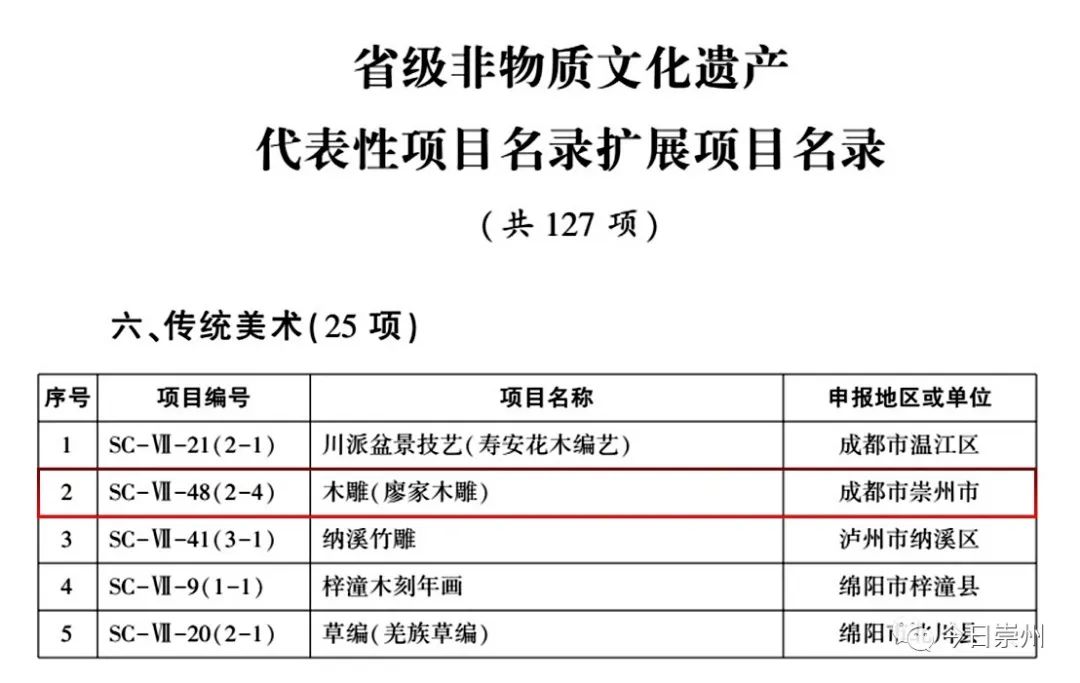 廖家木雕起源于清朝末年,从业者主要分布在今四川省崇州市廖家镇。这项雕刻技艺以楠木、樟木等为原材料,以选材、构图、精修等为主要工艺,主要用于民居建筑构件和实木家具的雕饰。