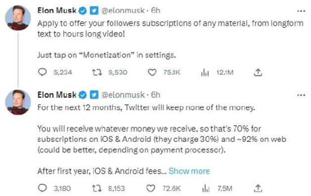 马斯克补充道,在服务上线最初的12个月中,内容发布者将获得除去移动平台费用(iOS或安卓商店抽成 30%)之外的全部订阅收入,推特不会从中截留任何一分钱。网页版则能让创作者拿到92%的收入,所以马斯克也更推荐这一选项。在推特设置中有一个名为“Monetization”的标签,通过该标签可以打开付费订阅功能,但对于这项功能的具体细节,马斯克并没有详述。