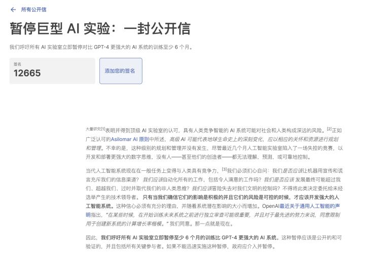 ChatGPT 已经初步展现了 AGI 的雏形,成为了各行各业工作人员的全能小助手,但如果任由其野蛮生长,不加于管制会不会有一天人类再也无法控制 AGI?意识到这个问题严重性,特斯拉 CEO 埃隆・马斯克、苹果联合创始人史蒂夫・沃兹尼亚克、图灵奖得主 Yoshua Bengio 等人带头签署公开信呼吁停止巨型人工智能实验至少 6 个月。